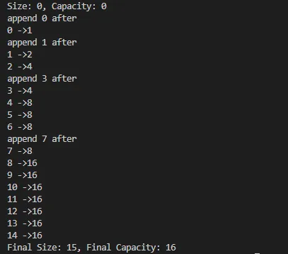 std::cout << "Final Size: " << v.size() << ", Final Capacity: " << v.capacity() << std::endl;